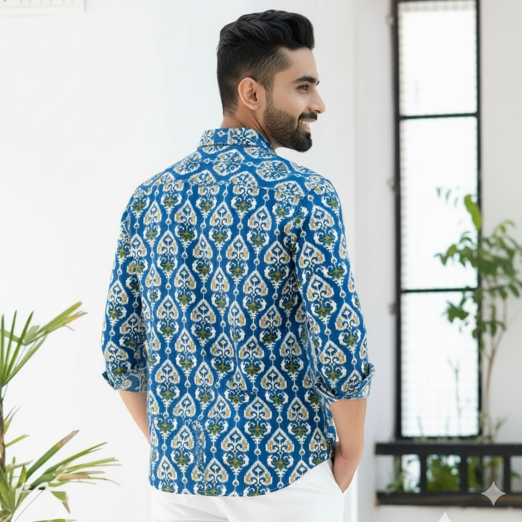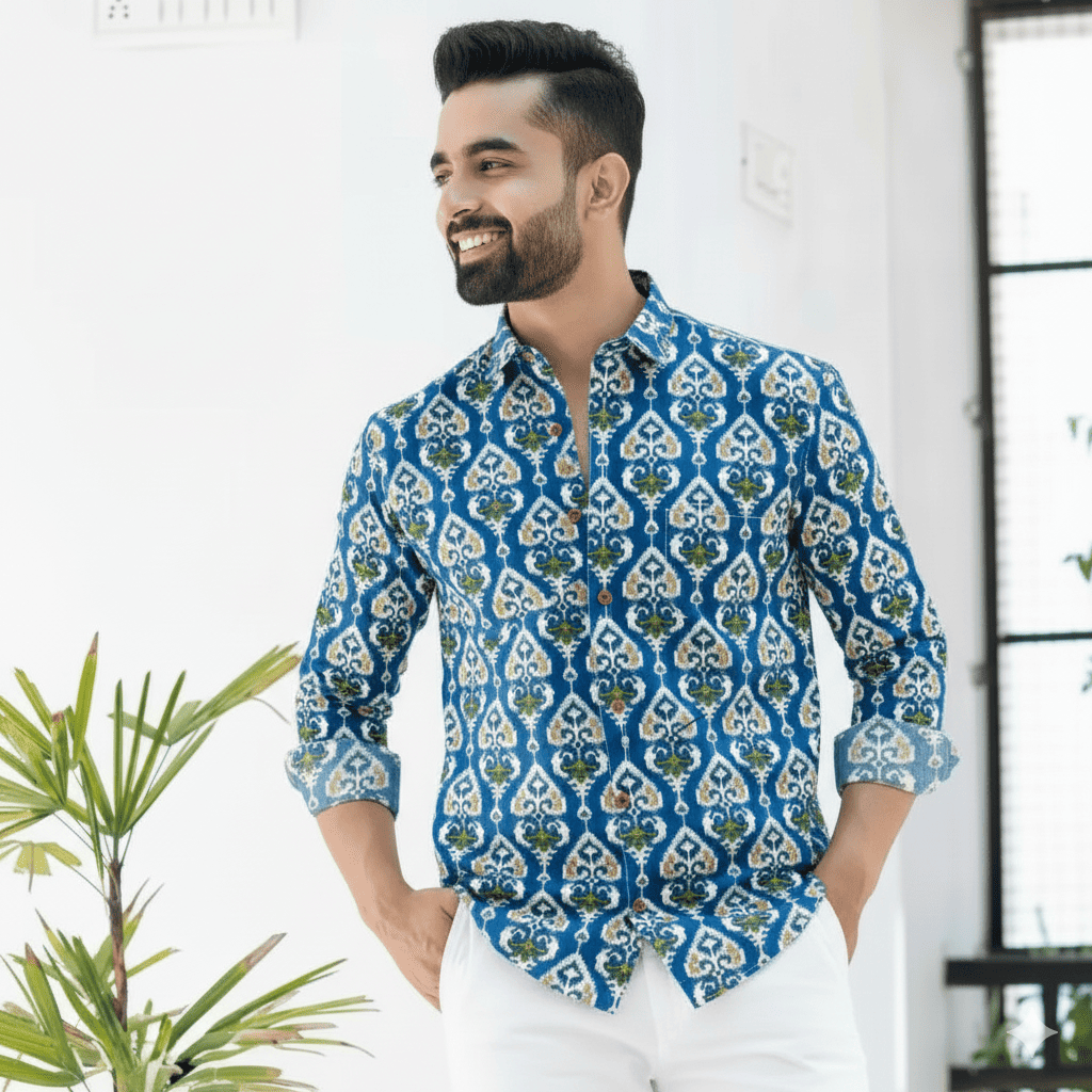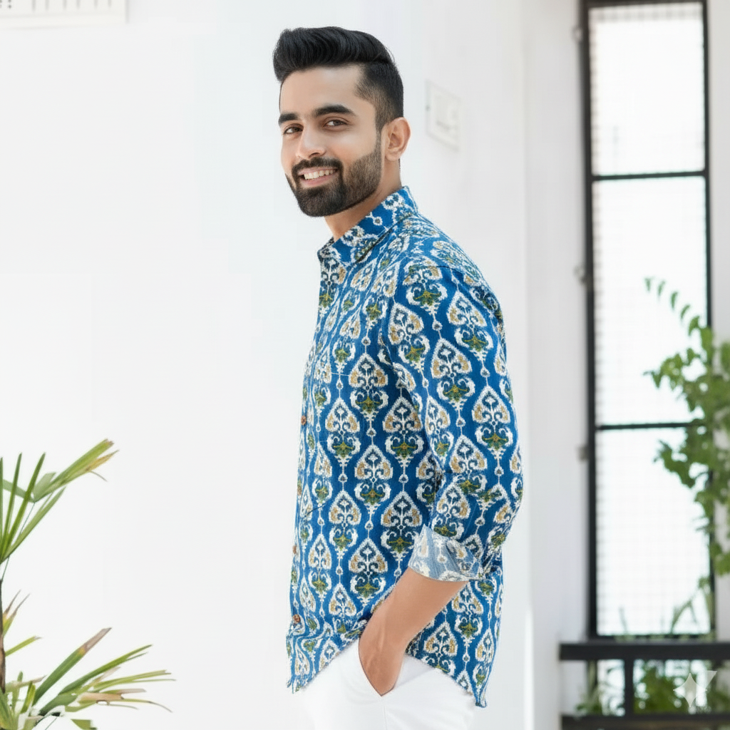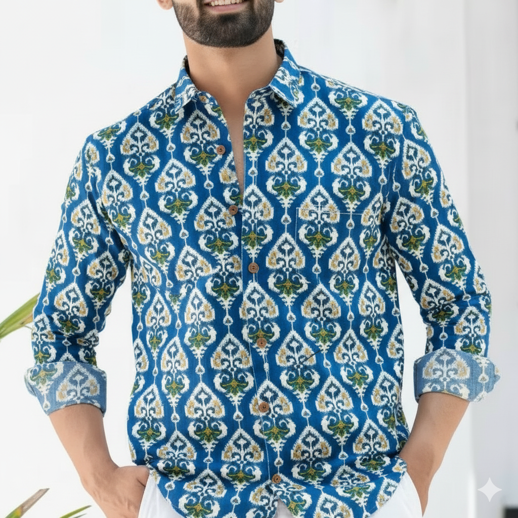 A captivating tribute to ancient elegance and vibrant artistry, the Aegean Dream Full-Sleeve Shirt is a symphony of intricate motifs, inspired by timeless patterns found in Greek or Mediterranean designs and elaborate textiles. With its bold blue canvas adorned with striking white, golden, and green symmetrical designs, this shirt reflects a sophisticated aesthetic with an effortless charm. A unique yet versatile statement for those who appreciate cultural depth and a touch of refined beauty.