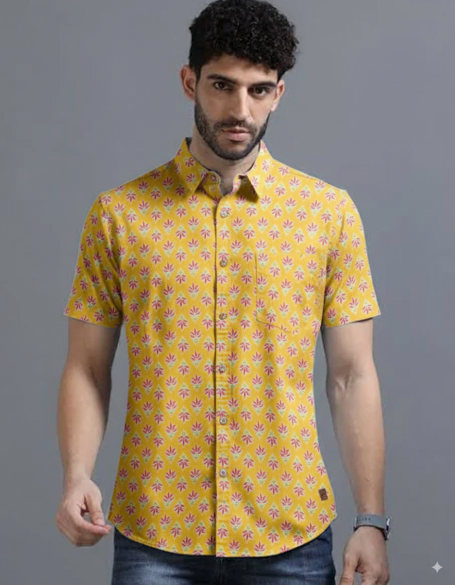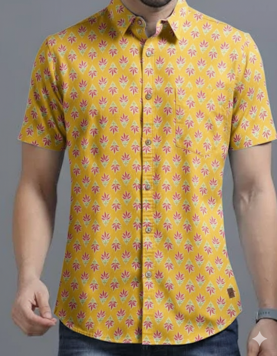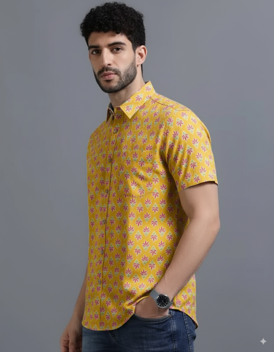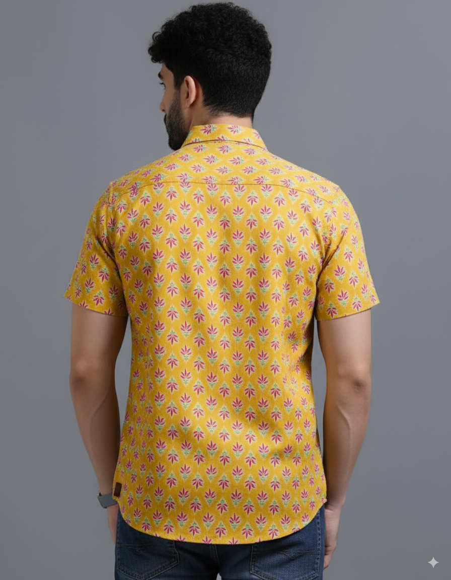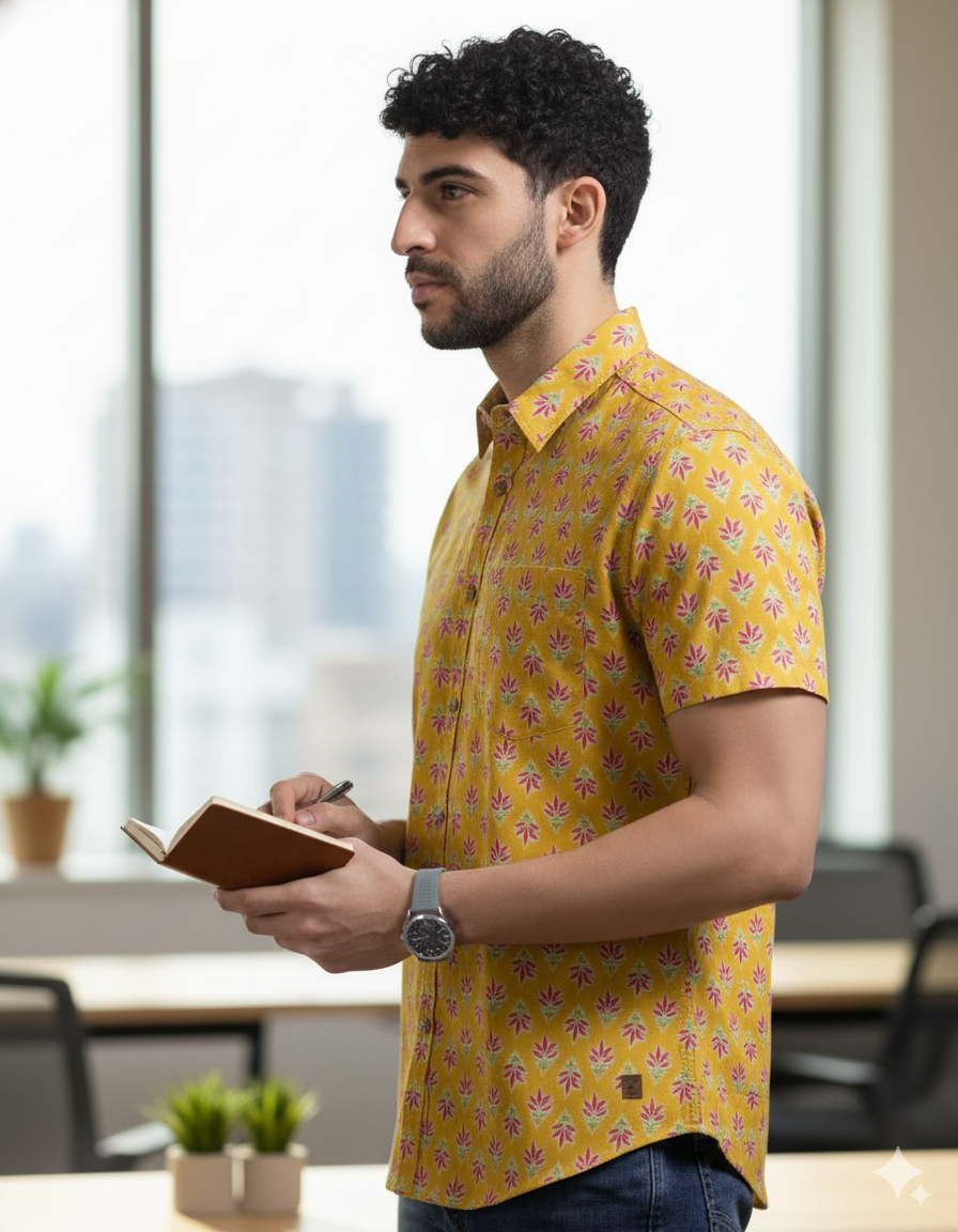 A radiant tribute to nature's artistry and cheerful style, the Amber Leaf Short Sleeve Shirt features a lively, repeating pattern of stylized leaves or petals. With its bright mustard yellow canvas adorned with vibrant pink and subtle green leaf motifs, this shirt reflects a sunny aesthetic with an effortless charm. A versatile yet distinctive statement for those who appreciate natural-inspired prints and a joyful splash of color.