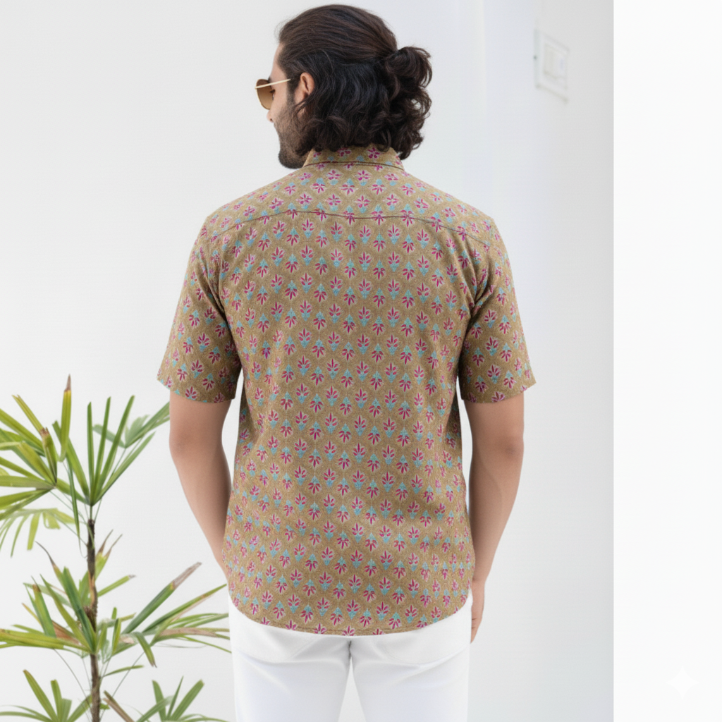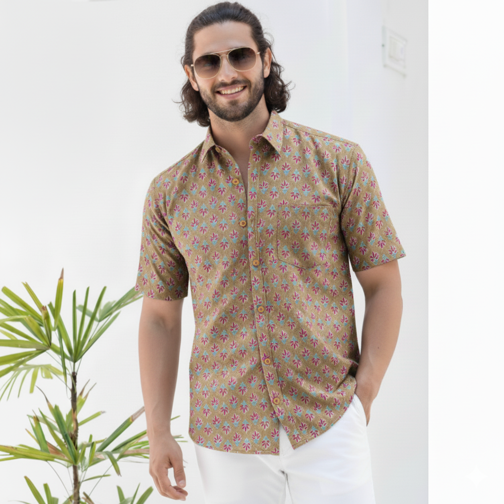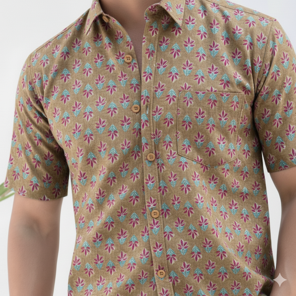 A warm and cheerful nod to bohemian style, the Blossom Tan Short Sleeve Shirt features a lively, repeating pattern of stylized flowers or leaves. With its earthen tan canvas adorned with vibrant pink and light blue motifs, this shirt reflects a light, sun-kissed aesthetic with an effortless charm. A versatile yet distinctive statement for those who appreciate natural-inspired prints and a joyful splash of color.