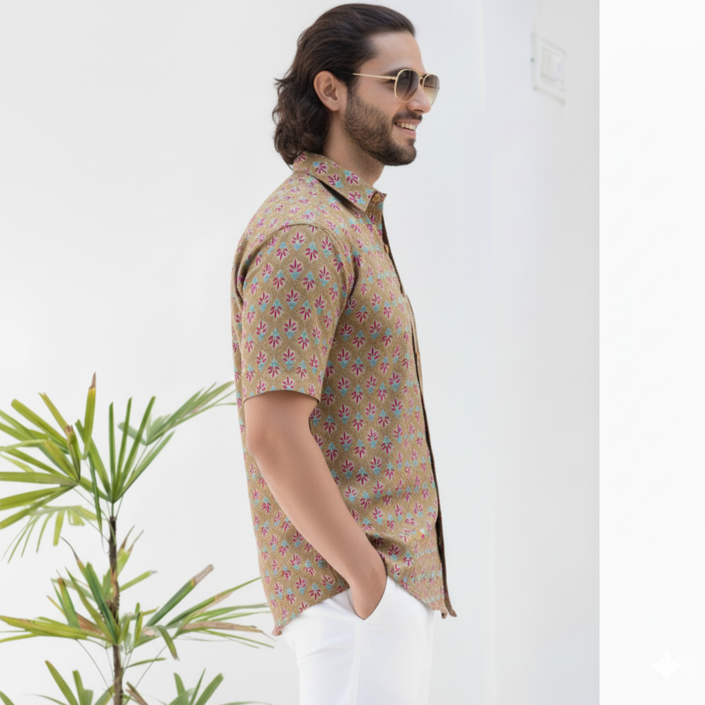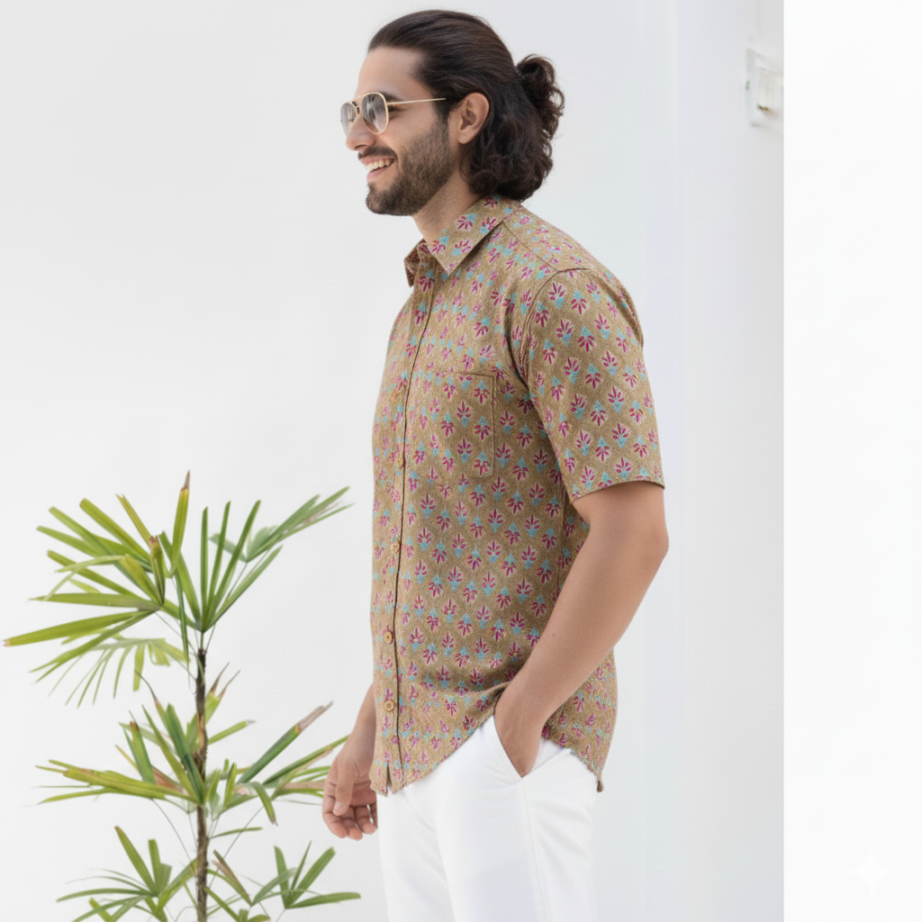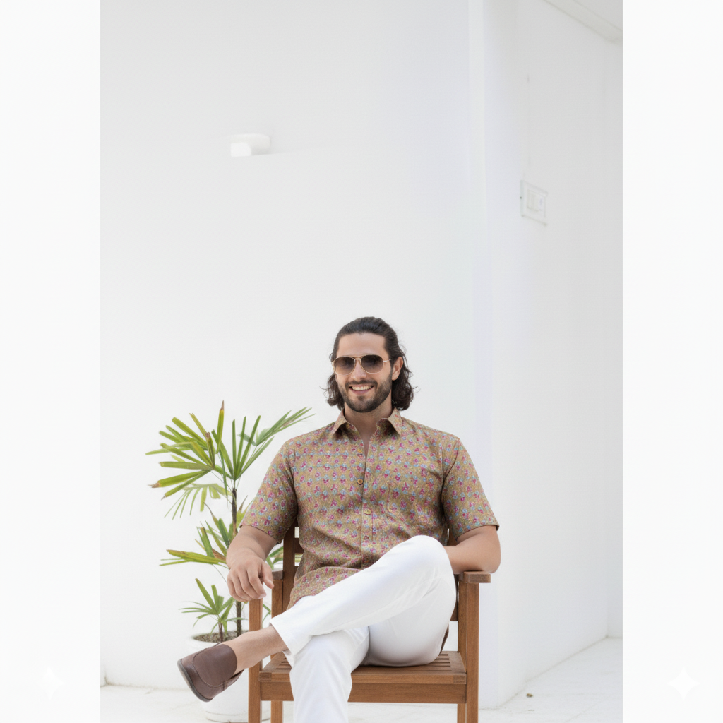 A warm and cheerful nod to bohemian style, the Blossom Tan Short Sleeve Shirt features a lively, repeating pattern of stylized flowers or leaves. With its earthen tan canvas adorned with vibrant pink and light blue motifs, this shirt reflects a light, sun-kissed aesthetic with an effortless charm. A versatile yet distinctive statement for those who appreciate natural-inspired prints and a joyful splash of color.