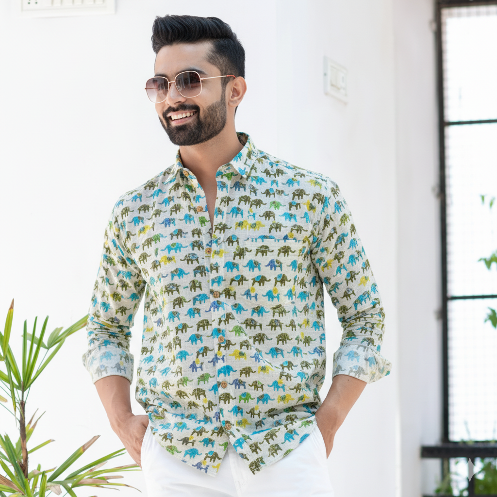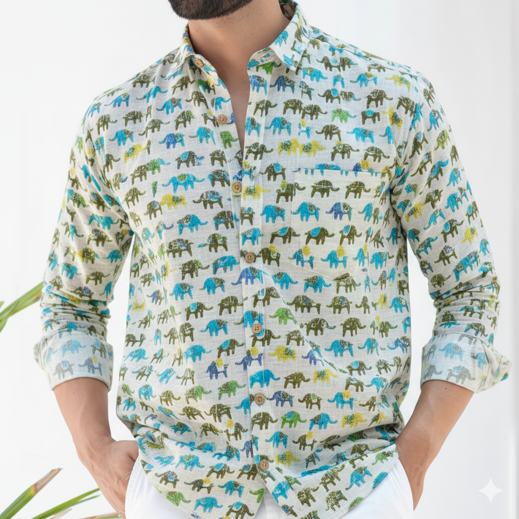 A jubilant tribute to vibrant traditions and playful spirits, the Carnival Herd Full-Sleeve Shirt is a delightful symphony of colorful elephant motifs, inspired by festive parades and joyful celebrations. With its light, crisp canvas adorned with an array of blue, green, yellow, and brown elephants, this shirt reflects a cheerful aesthetic with an effortless charm. A bold yet fun statement for those who appreciate lively patterns and unique style.