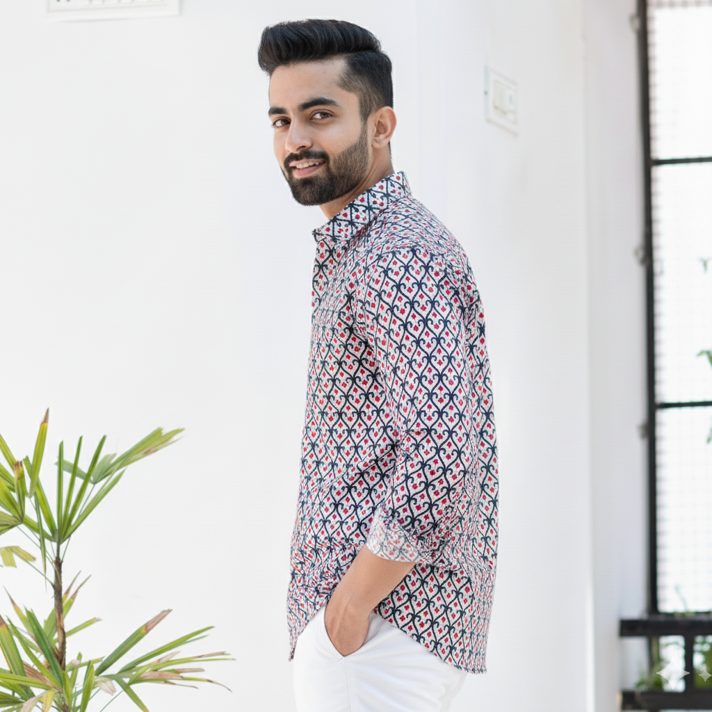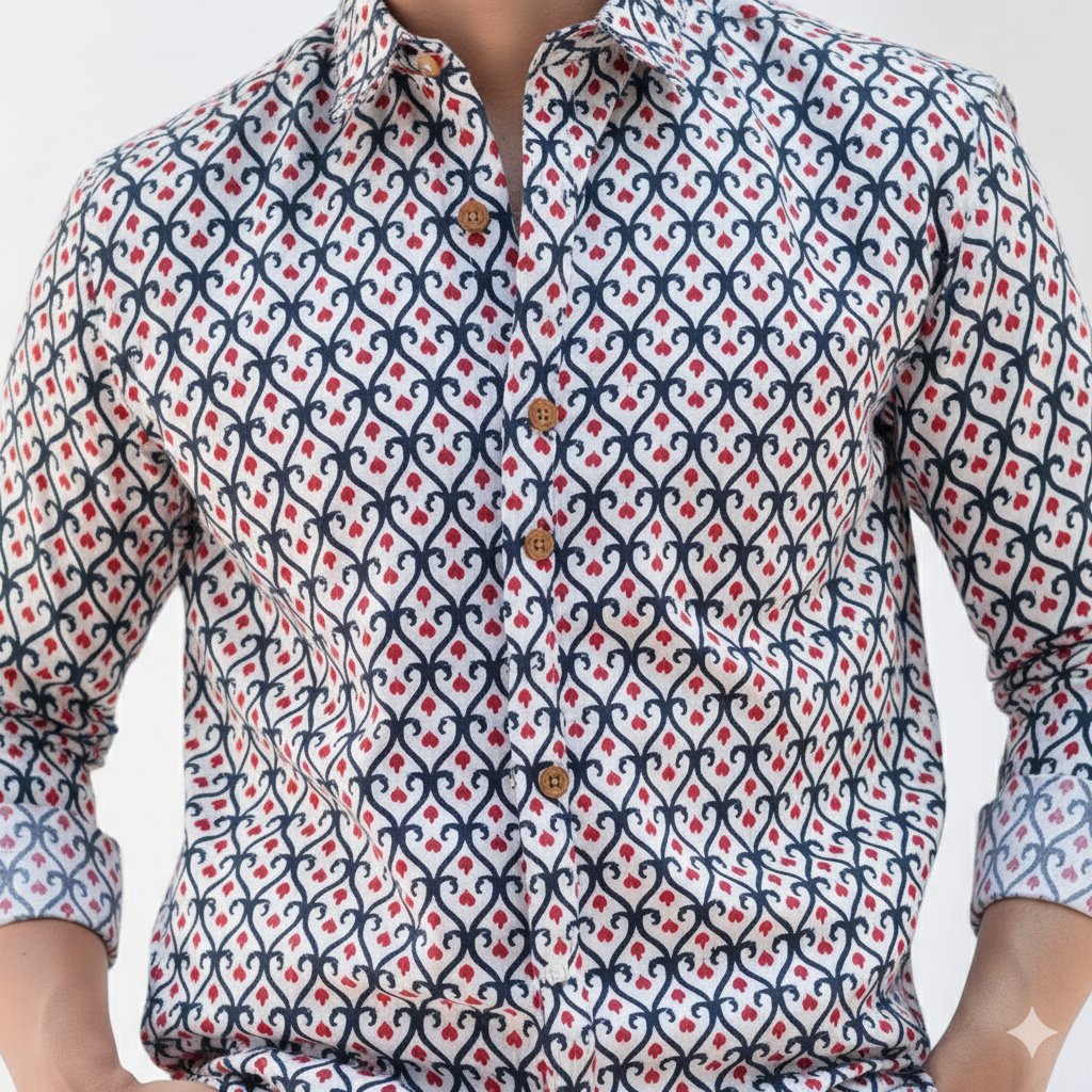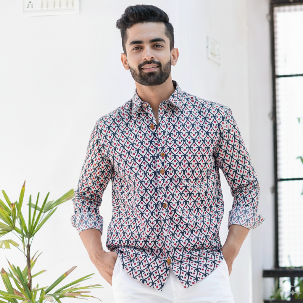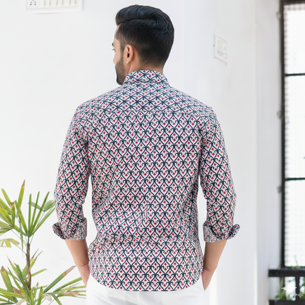 A captivating tribute to intricate artistry and dynamic patterns, the Cosmic Swirl Full-Sleeve Shirt is a mesmerizing symphony of interconnected motifs, reminiscent of celestial orbits and elegant tapestries. With its crisp white canvas adorned with deep blue interlocking swirls and subtle red dots, this shirt reflects a sophisticated aesthetic with an effortless charm. A unique yet versatile statement for those who appreciate intricate designs and a touch of the extraordinary.