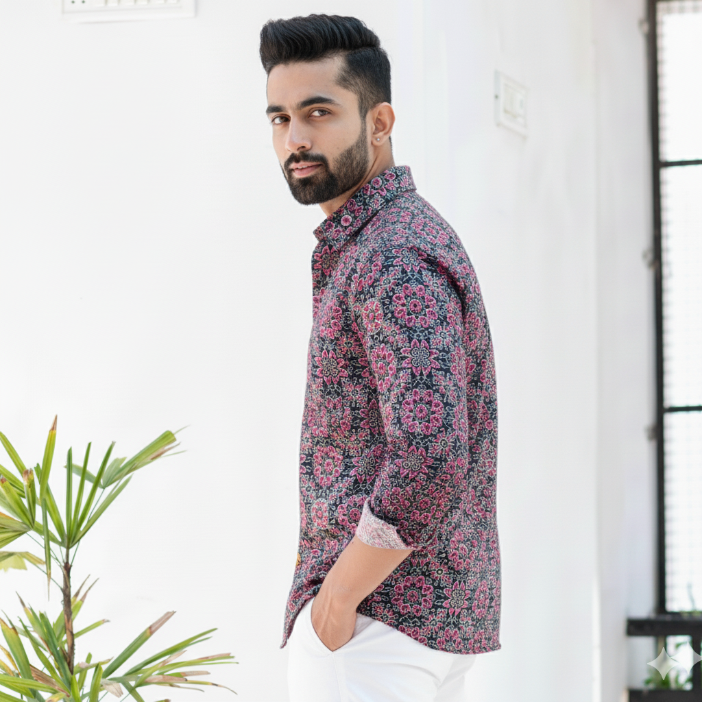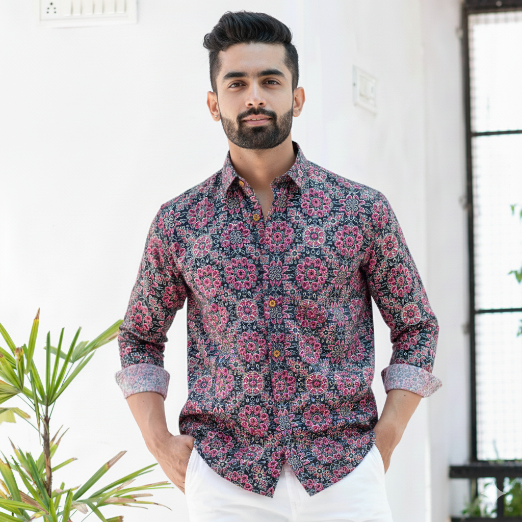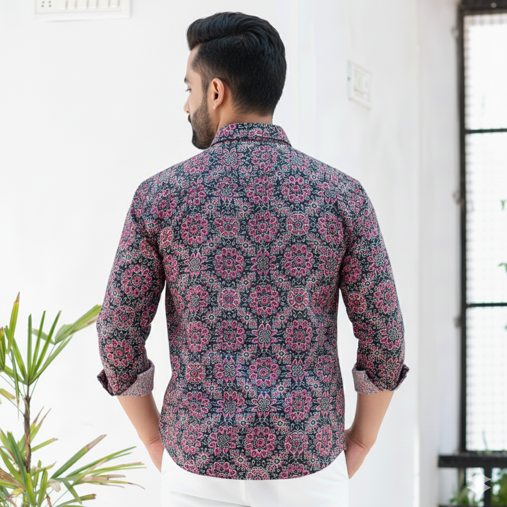 A captivating tribute to rich artistry and festive elegance, the Crimson Bloom Full-Sleeve Shirt is a symphony of intricate floral-geometric motifs, inspired by traditional designs and vibrant celebrations. With its deep navy canvas adorned with striking crimson and off-white patterns, this shirt reflects a sophisticated aesthetic with an effortless charm. A bold yet elegant statement for those who appreciate cultural depth and unique style.