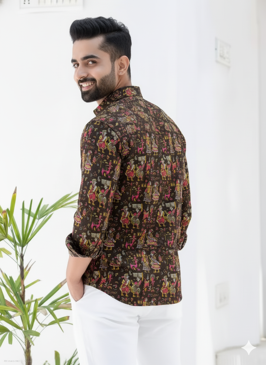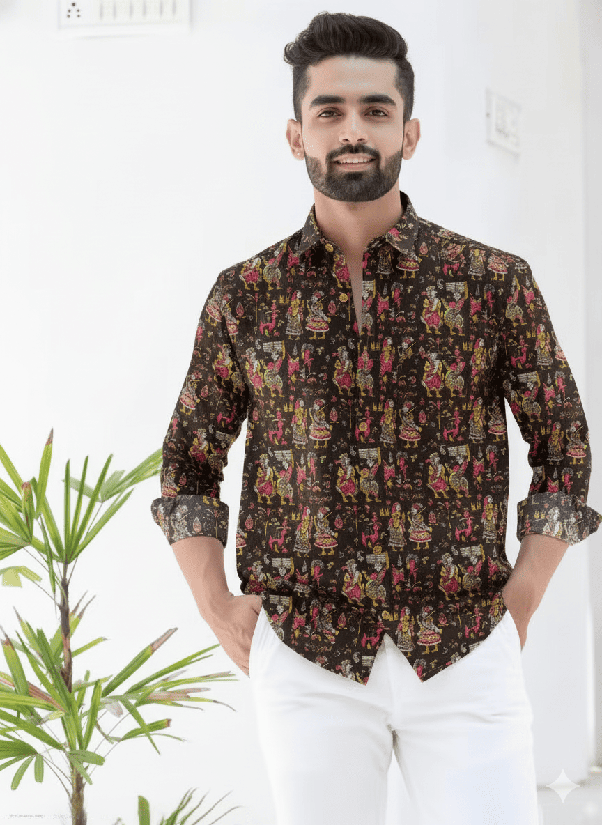Style Details: Featuring a classic full-sleeve silhouette and a regular fit, the Festive Folk Full-Sleeve Shirt exudes effortless charm and a distinctive presence. The captivating figurative design makes it an ideal choice for cultural events, artistic gatherings, and expressive statement styling."