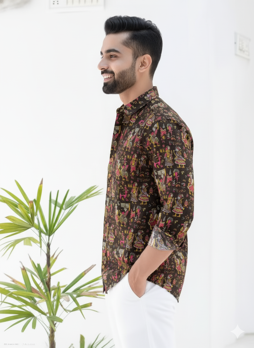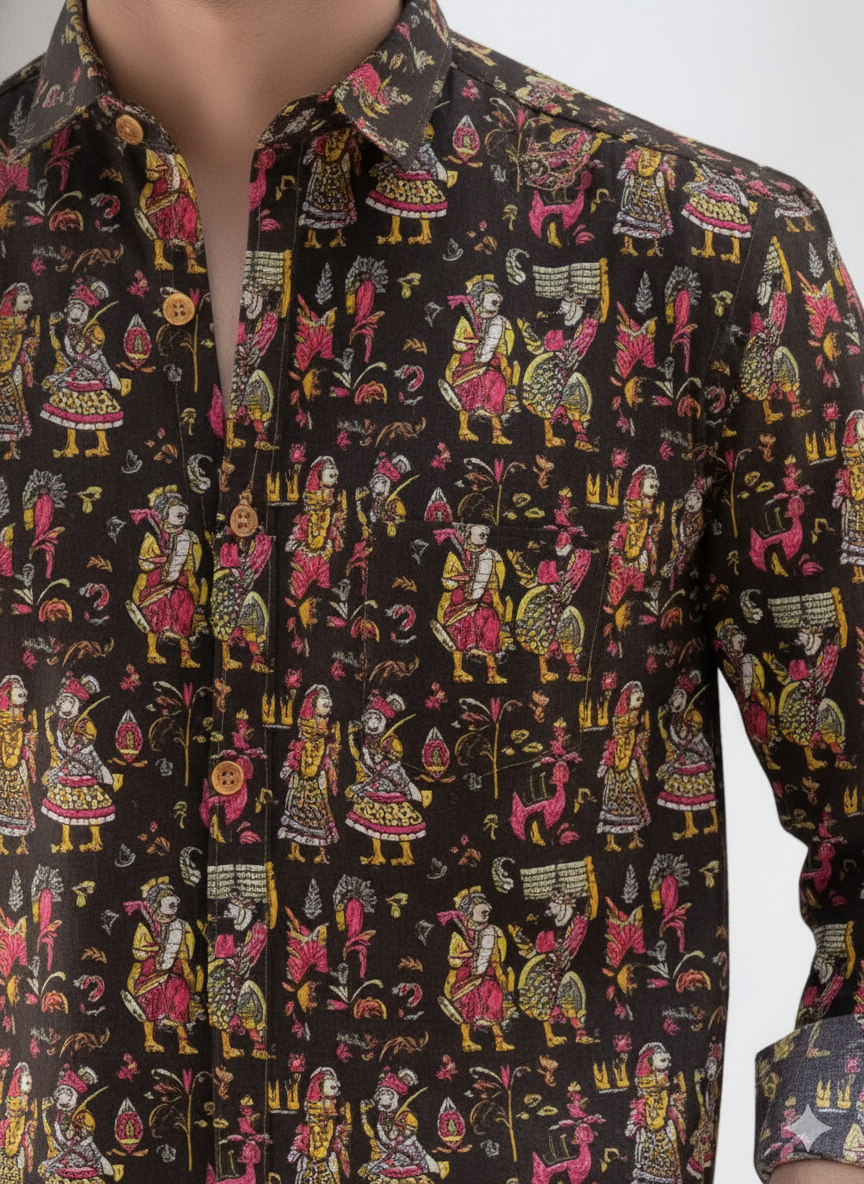 A vibrant tribute to cultural celebrations and traditional artistry, the Festive Folk Full-Sleeve Shirt is a lively symphony of figurative motifs, inspired by folk dances, musical gatherings, and the rich heritage of rural life. With its dark charcoal canvas adorned with colorful depictions of people in shades of pink, yellow, green, and white, this shirt reflects a joyous aesthetic with an effortless charm. A unique and spirited statement for those who appreciate cultural expressions and distinctive style.