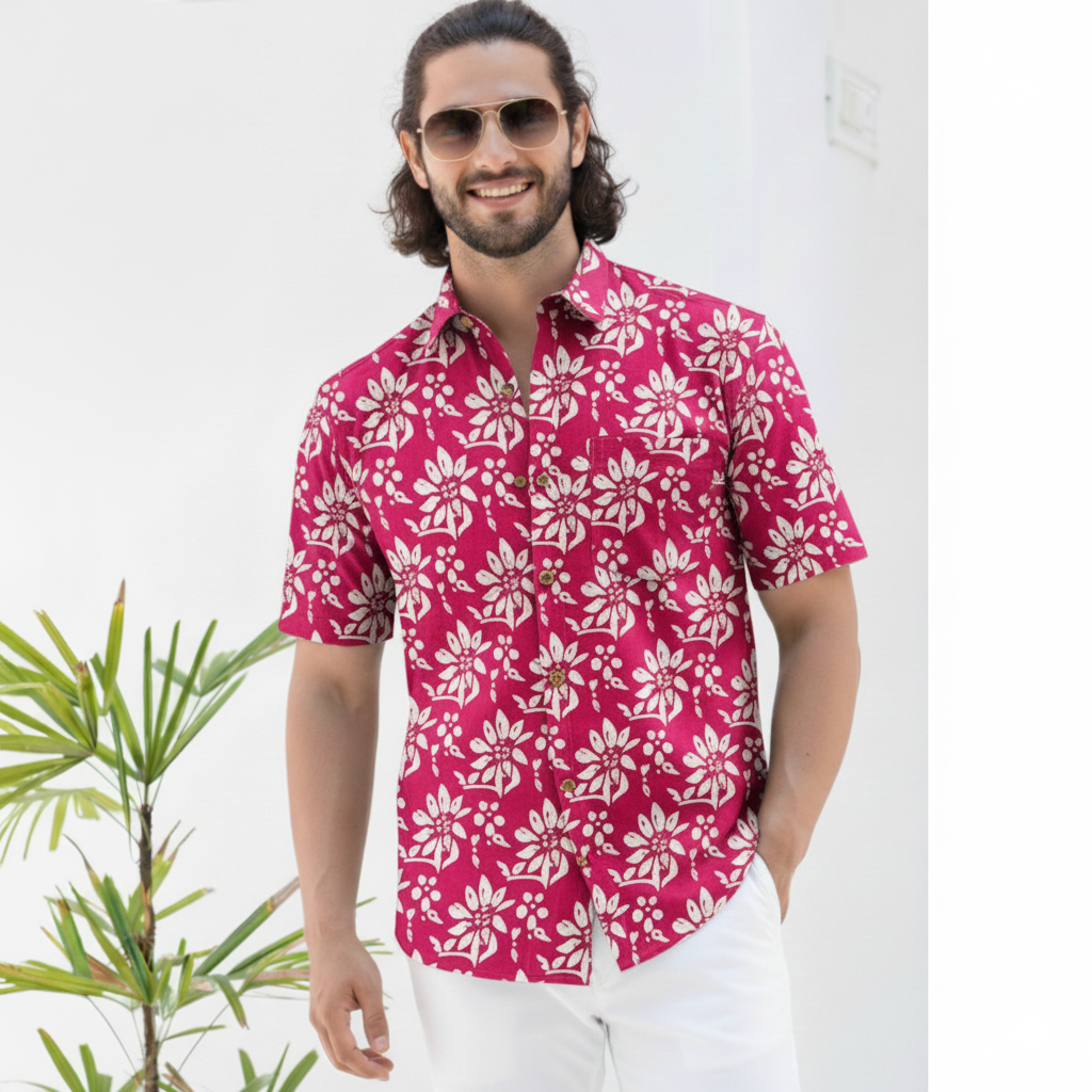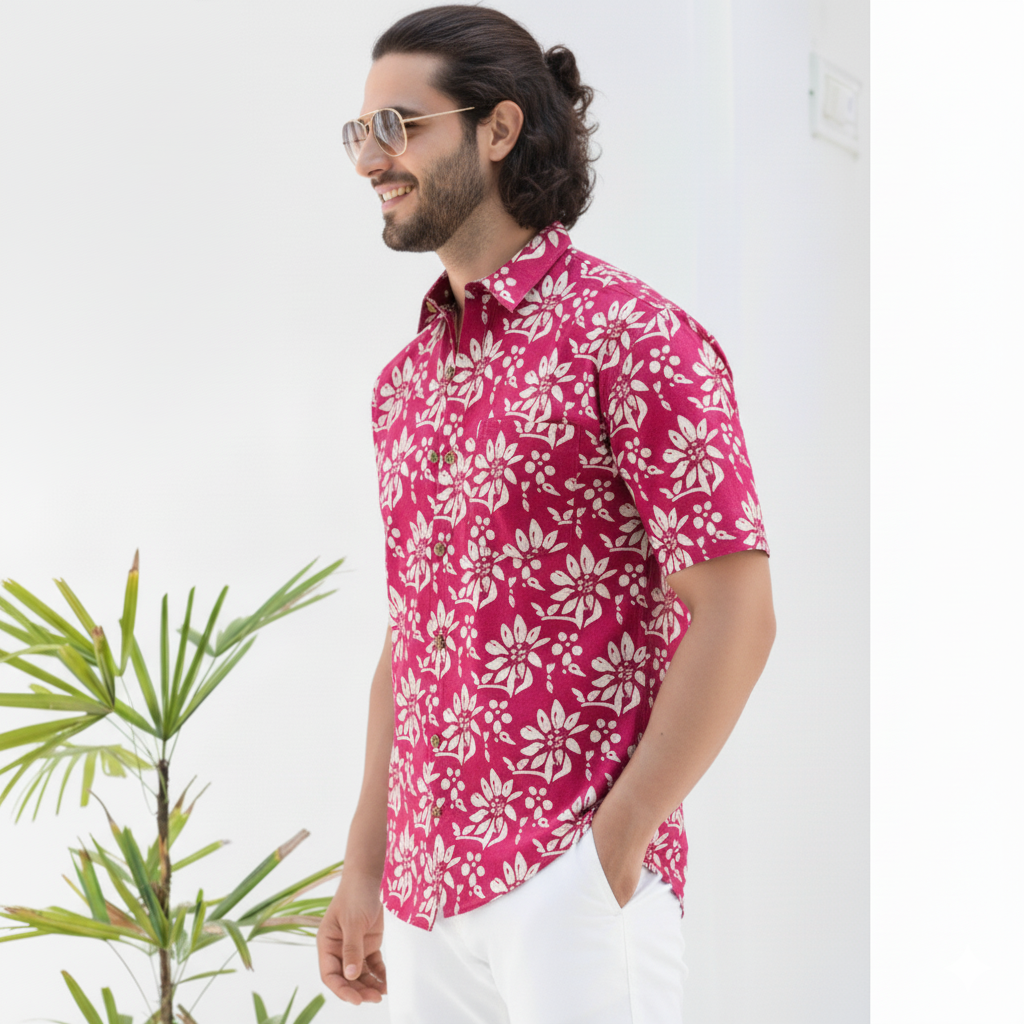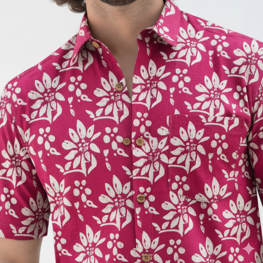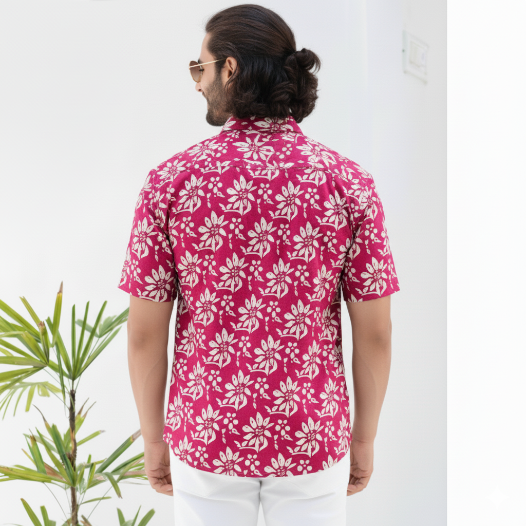 A vibrant tribute to spirited elegance and blossoming beauty, the Fuchsia Bloom Collar Shirt is a captivating play of bold floral motifs, inspired by lush gardens and festive celebrations. With its striking fuchsia background adorned with intricate white blossoms, this shirt reflects a joyful aesthetic with an effortless charm. A bold yet sophisticated statement for those who appreciate vivid colors and unique style.