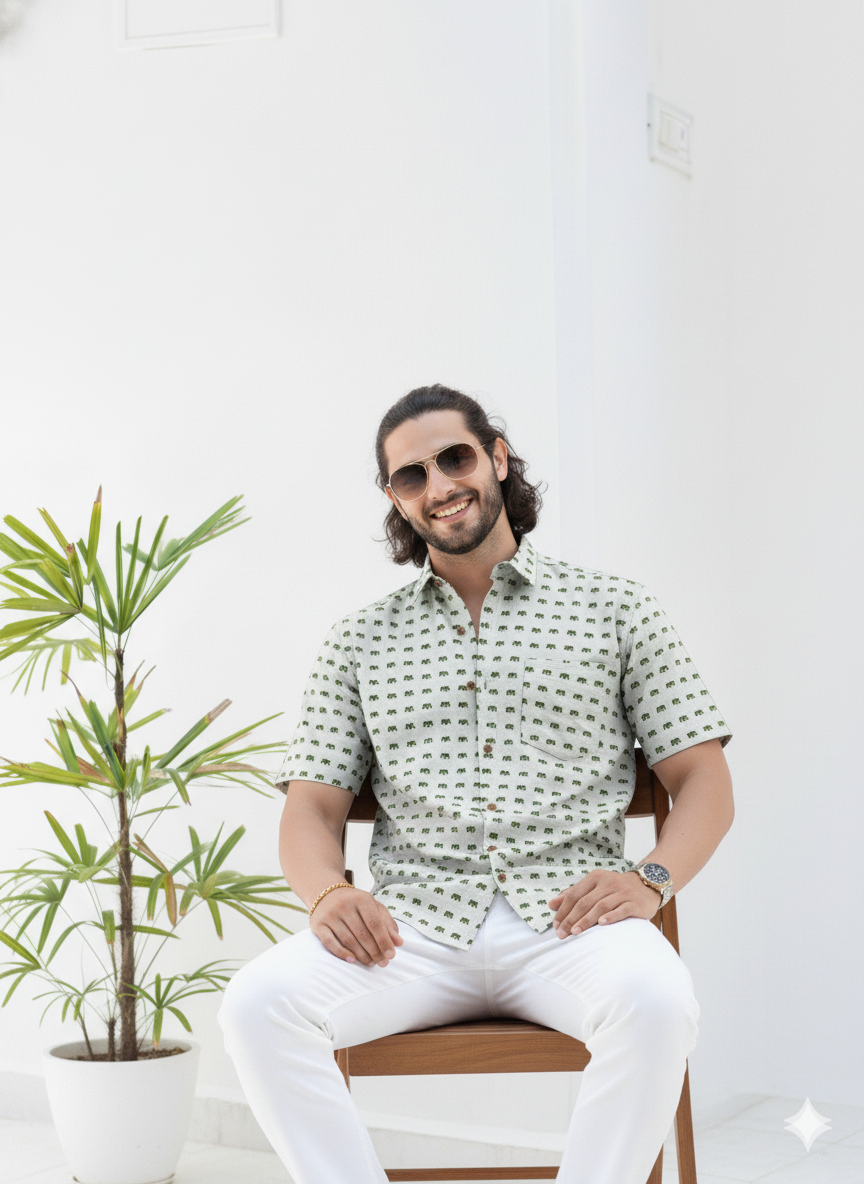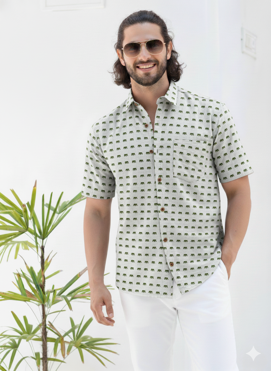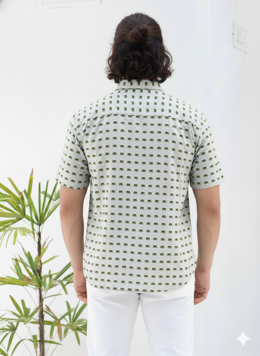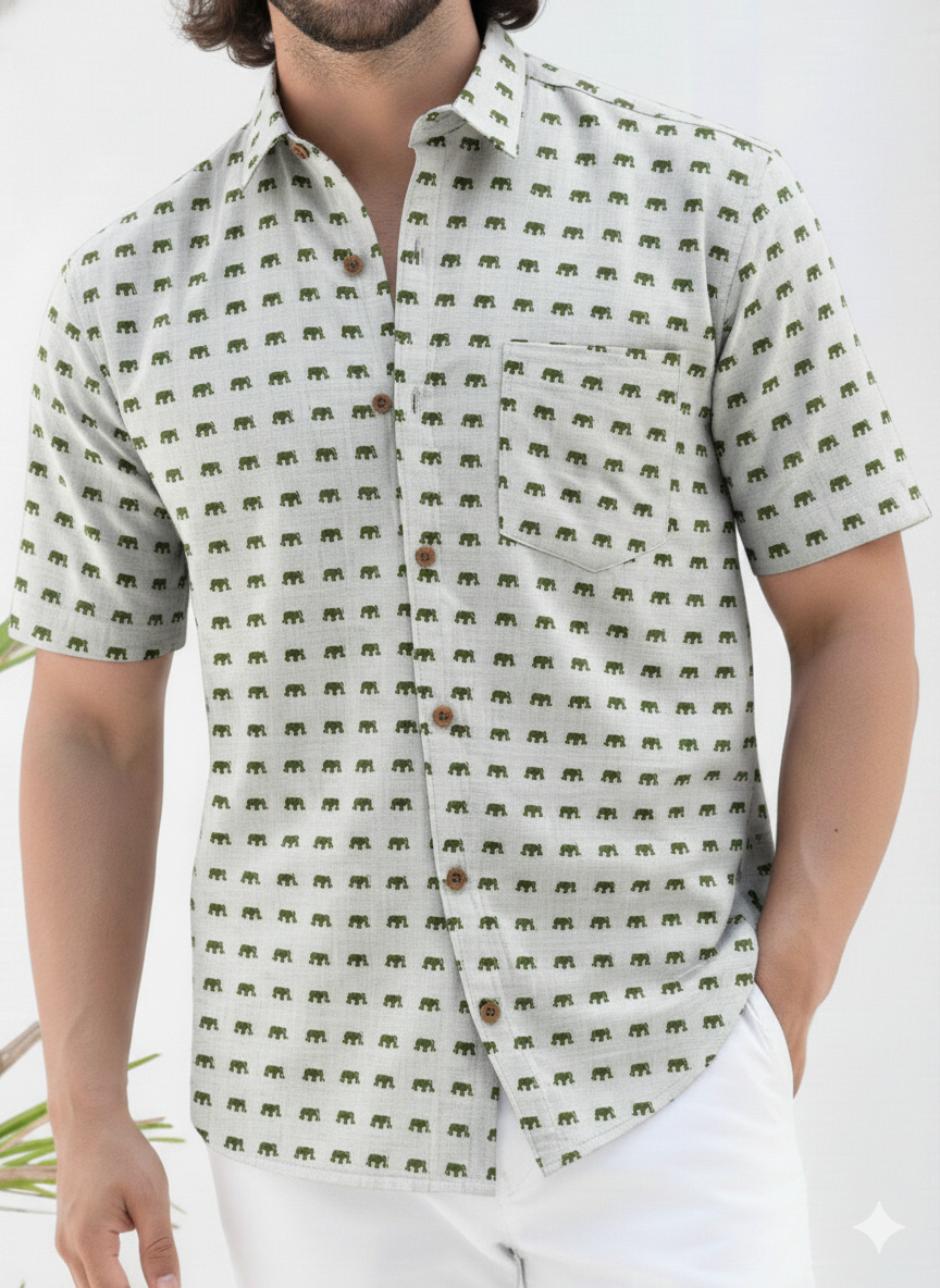 "Embark on a stylish adventure with our JungleStride Collar Shirt. Featuring an adorable and intricate pattern of marching elephants in subtle olive green on a crisp white background, this shirt brings a playful yet refined touch to your everyday wear. It's designed for those who appreciate unique details and a touch of whimsy.