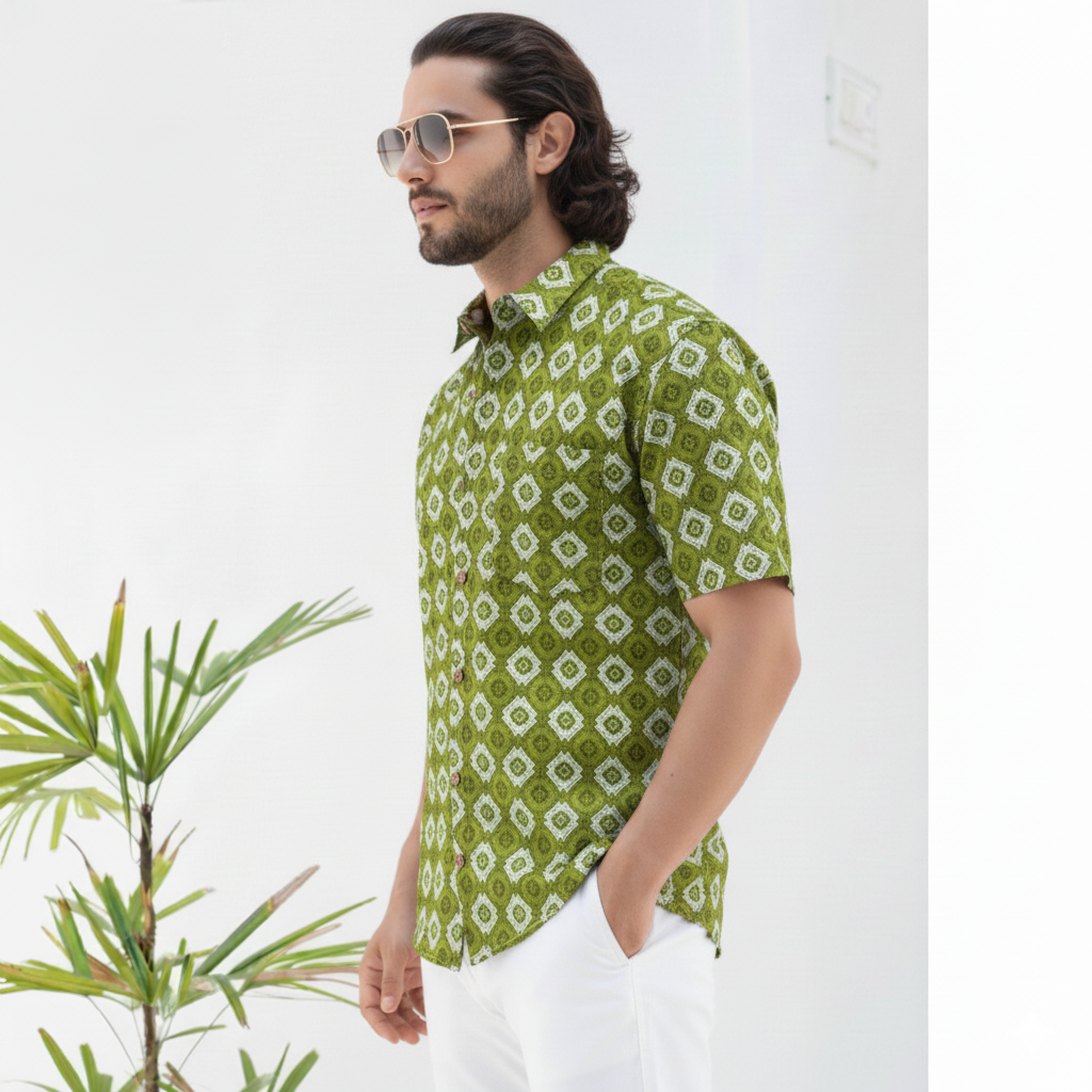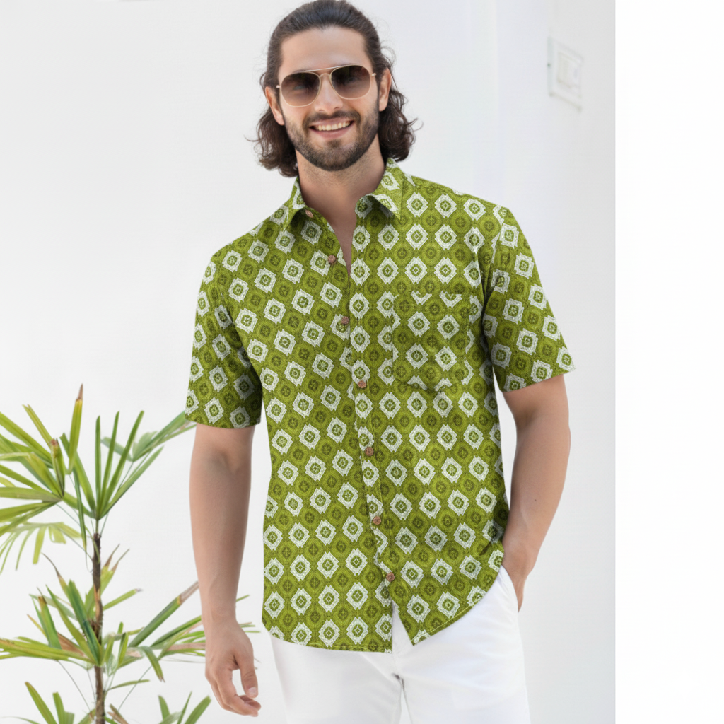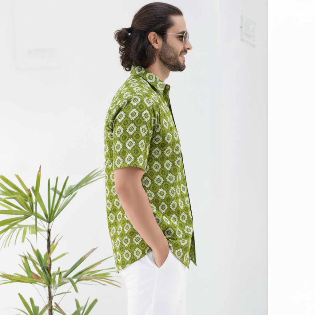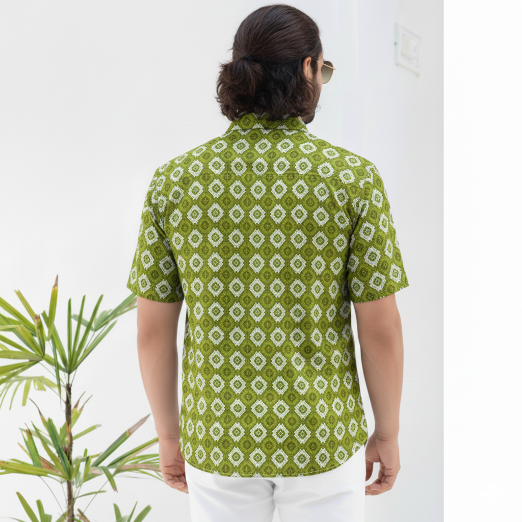 A refreshing tribute to natural beauty and timeless artistry, the Oasis Bloom Collar Shirt is a captivating play of intricate geometric motifs, inspired by blossoming gardens and classic patterns. With its vibrant olive green and crisp white diamond pattern, this shirt reflects a fresh aesthetic with an effortless charm. A cheerful yet sophisticated statement for those who appreciate natural elegance and unique style.