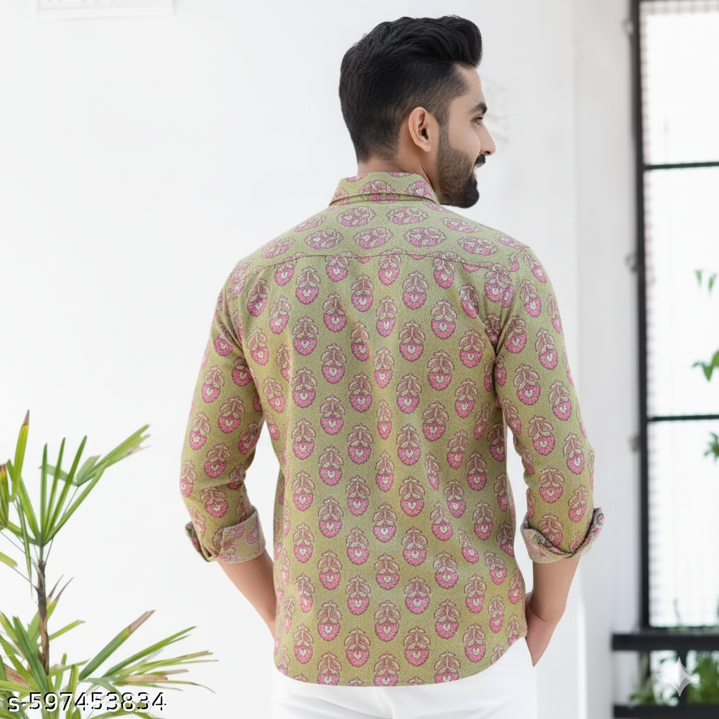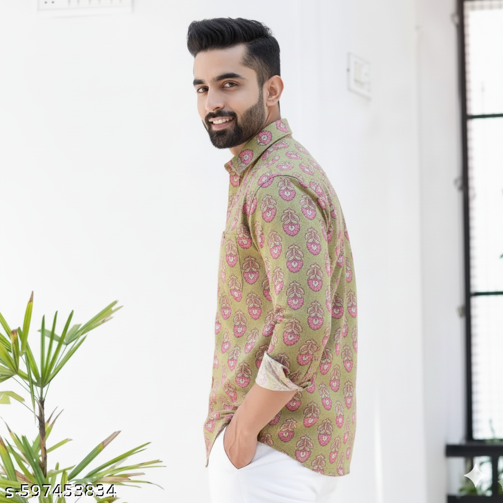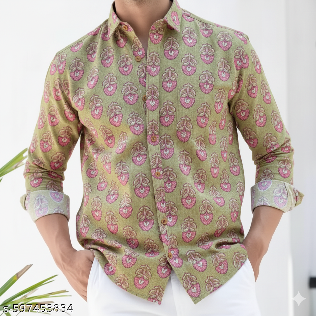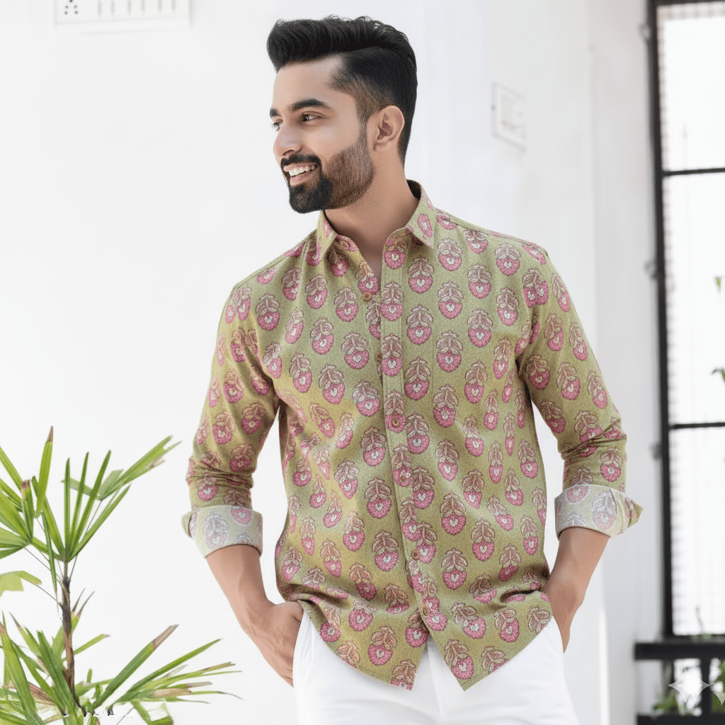 A harmonious tribute to subtle beauty and botanical grace, the Petal Aura Full-Sleeve Shirt is a captivating symphony of stylized floral or paisley motifs, reminiscent of soft petals and delicate organic patterns. With its gentle olive-green canvas adorned with charming pink designs, this shirt reflects a sophisticated aesthetic with an effortless charm. A versatile yet distinctive statement for those who appreciate refined patterns and a touch of warm elegance.