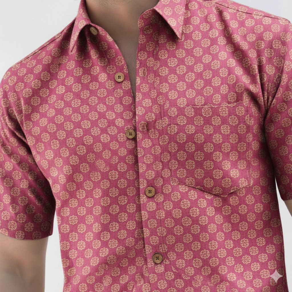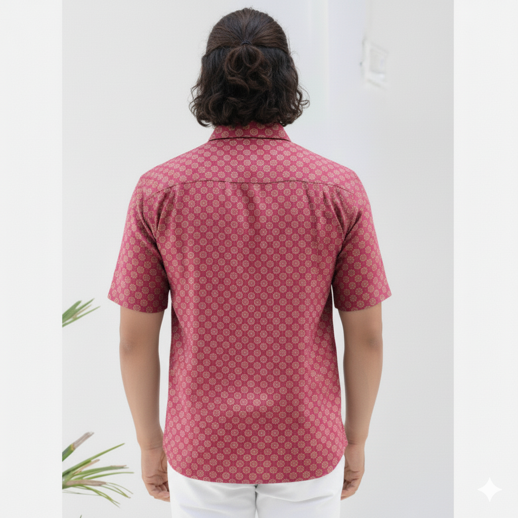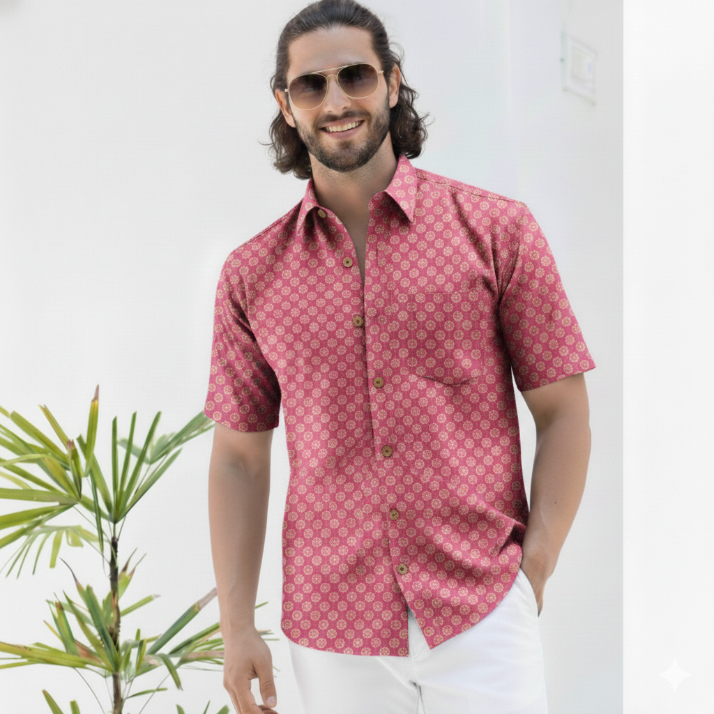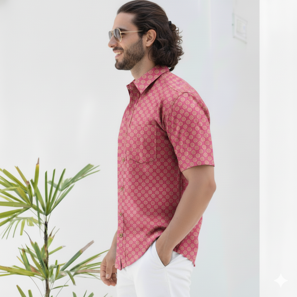 A playful nod to understated charm and modern casual wear, the Pink Dot Delight Half Sleeve Shirt features a subtle, repeating pattern of small circular or stylized dot motifs. With its bright and cheerful pink canvas adorned with delicate lighter pink or white dots, this shirt reflects a fresh aesthetic with an effortless charm. A versatile yet distinctive statement for those who appreciate simple elegance and a touch of joyful color.
