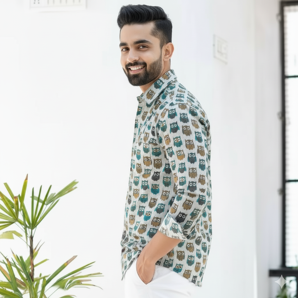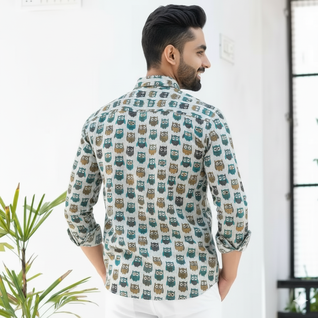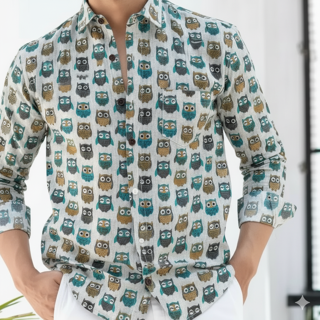 A charming tribute to wisdom and playful individuality, the Wise Hoot Full-Sleeve Shirt is a delightful symphony of adorable owl motifs, inspired by forest nights and intriguing creatures. With its light canvas adorned with an array of colorful owls in shades of blue, teal, brown, and grey, this shirt reflects a whimsical aesthetic with an effortless charm. A smart yet fun statement for those who appreciate unique patterns and a touch of character.